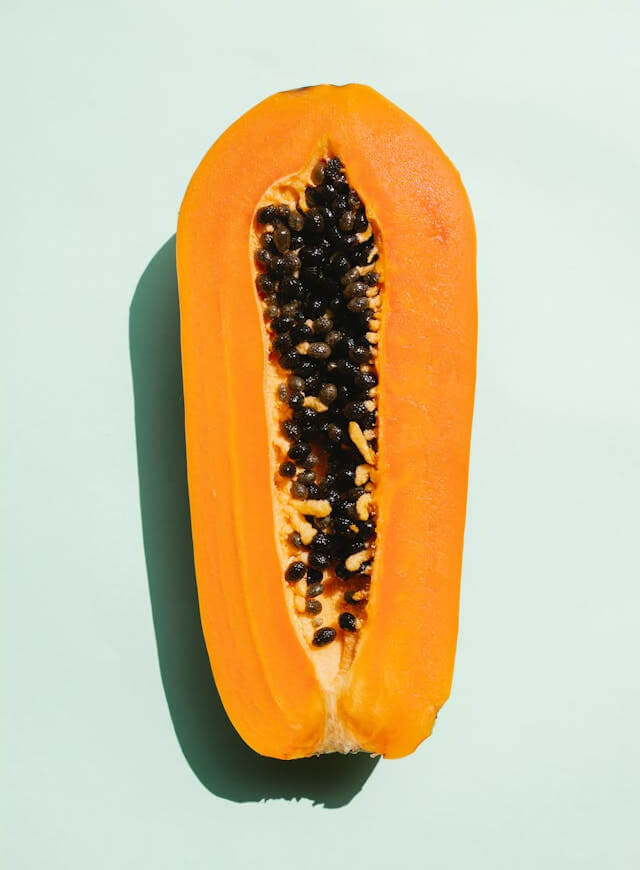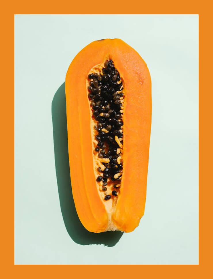 In this example, we delete a uniform orange margin that was added around a papaya JPEG photo. The margin width is set to 50 pixels on all four sides, resulting in a clean image of the papaya on a blue background, with no surrounding frame. (Source: Pexels.)