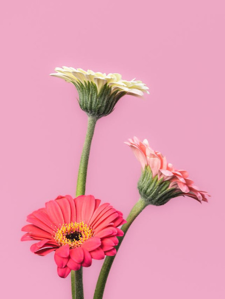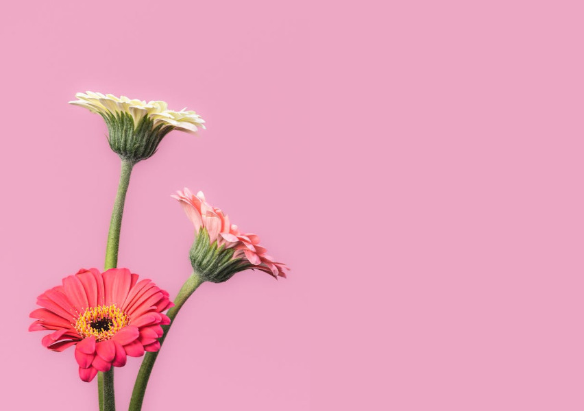 In this example, we wrap the JPG of gerbera daisies with empty space on the right side. We use the current background color (#eda8c4) to fill the new area and set the space width to 400 pixels. This shifts the flower composition to the left, freeing up enough space on the right for captions, quotes, or other design elements. (Source: Pexels.)